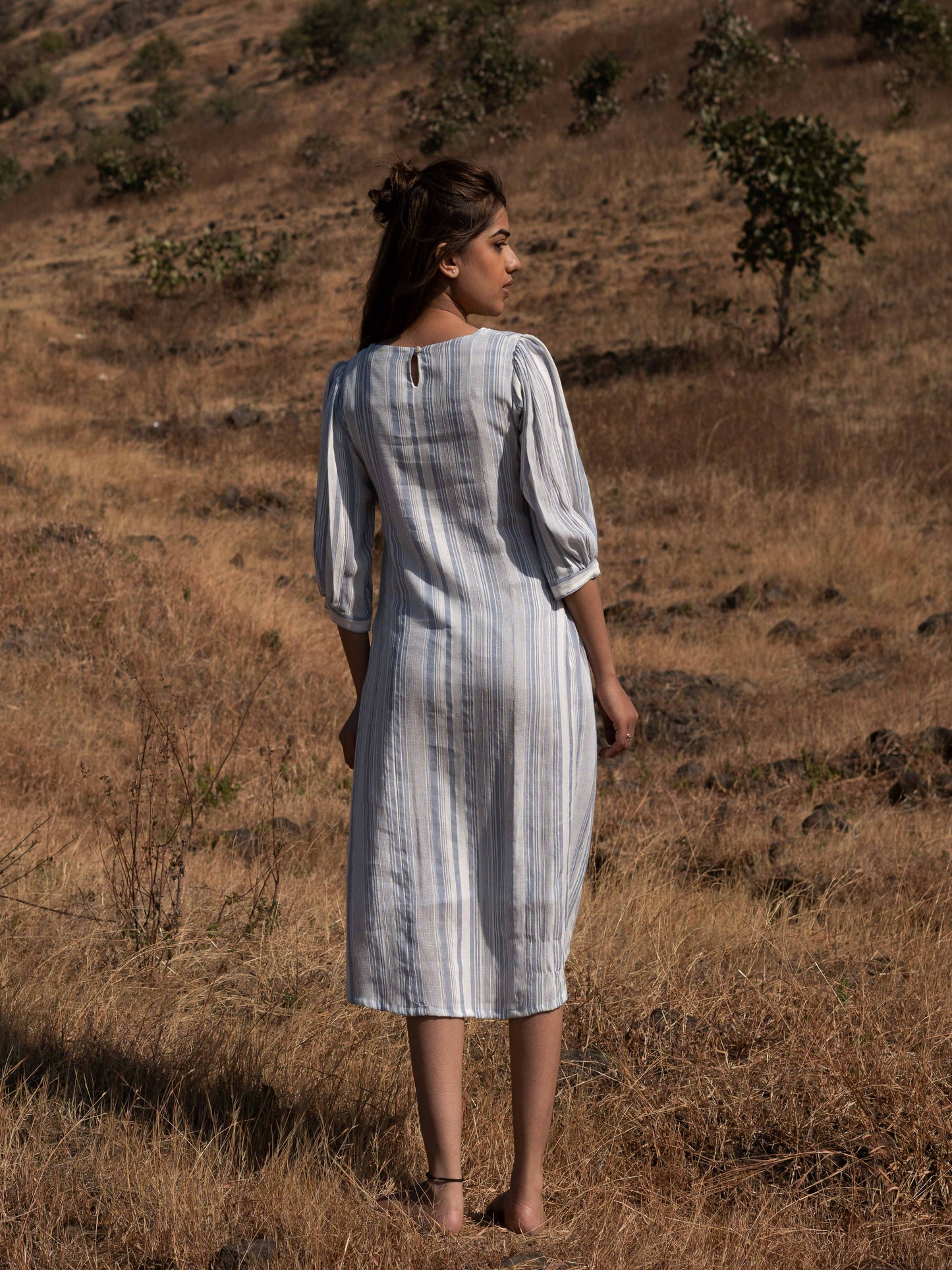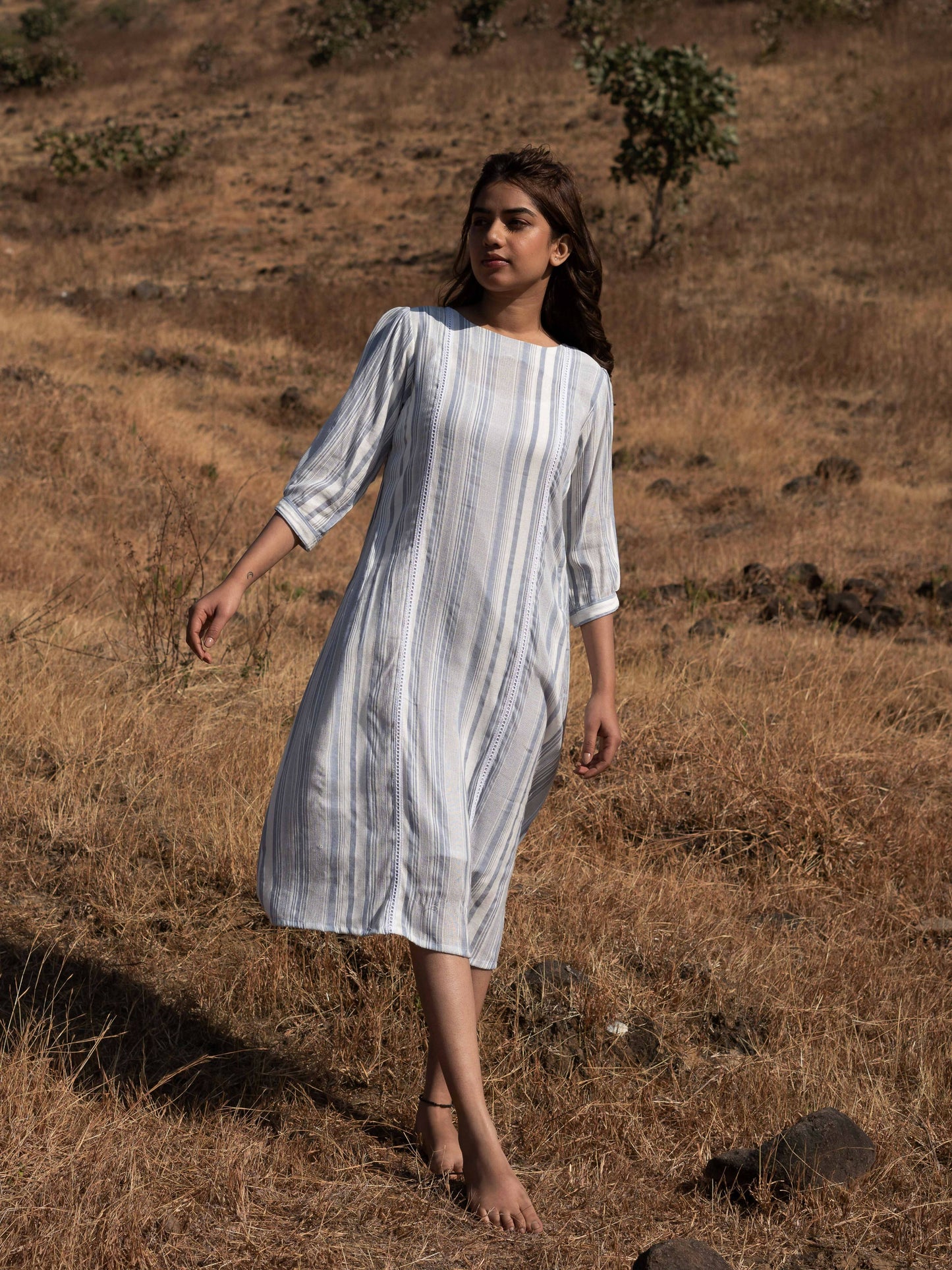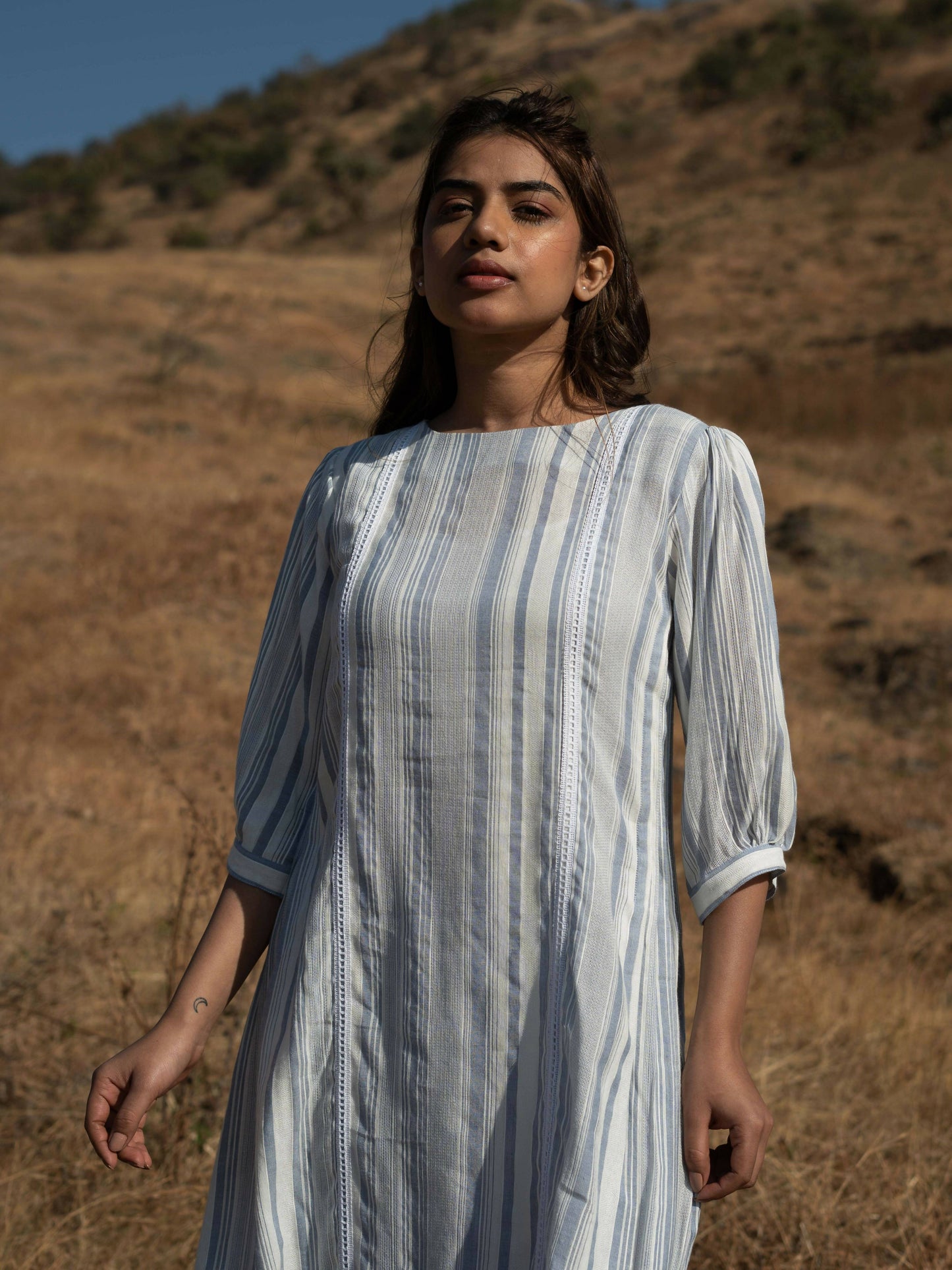 Greyish Blue - Off White knee length Dress with lace detailing on the front. The dress has inseam pockets.The dress comes with a Slip.