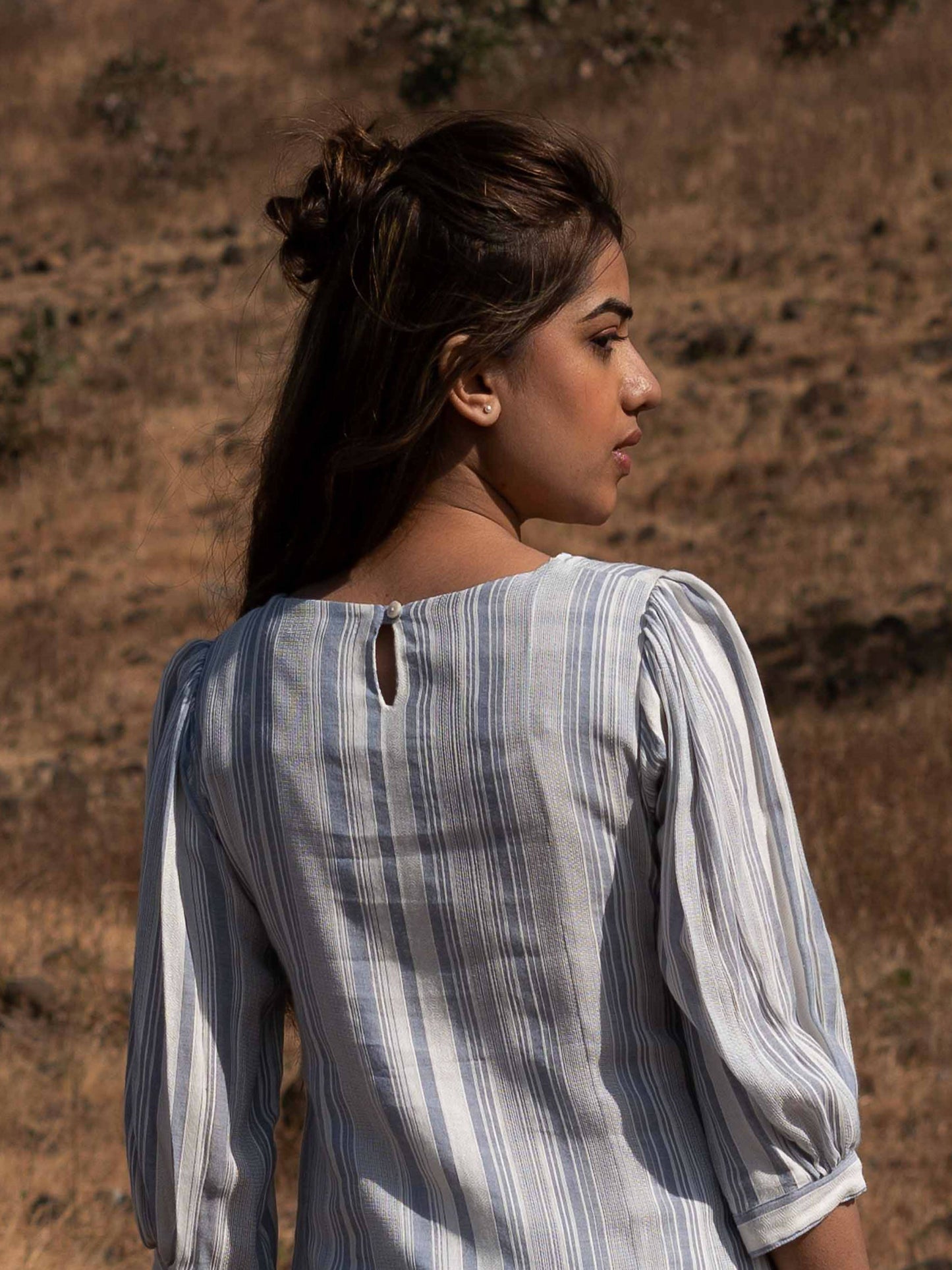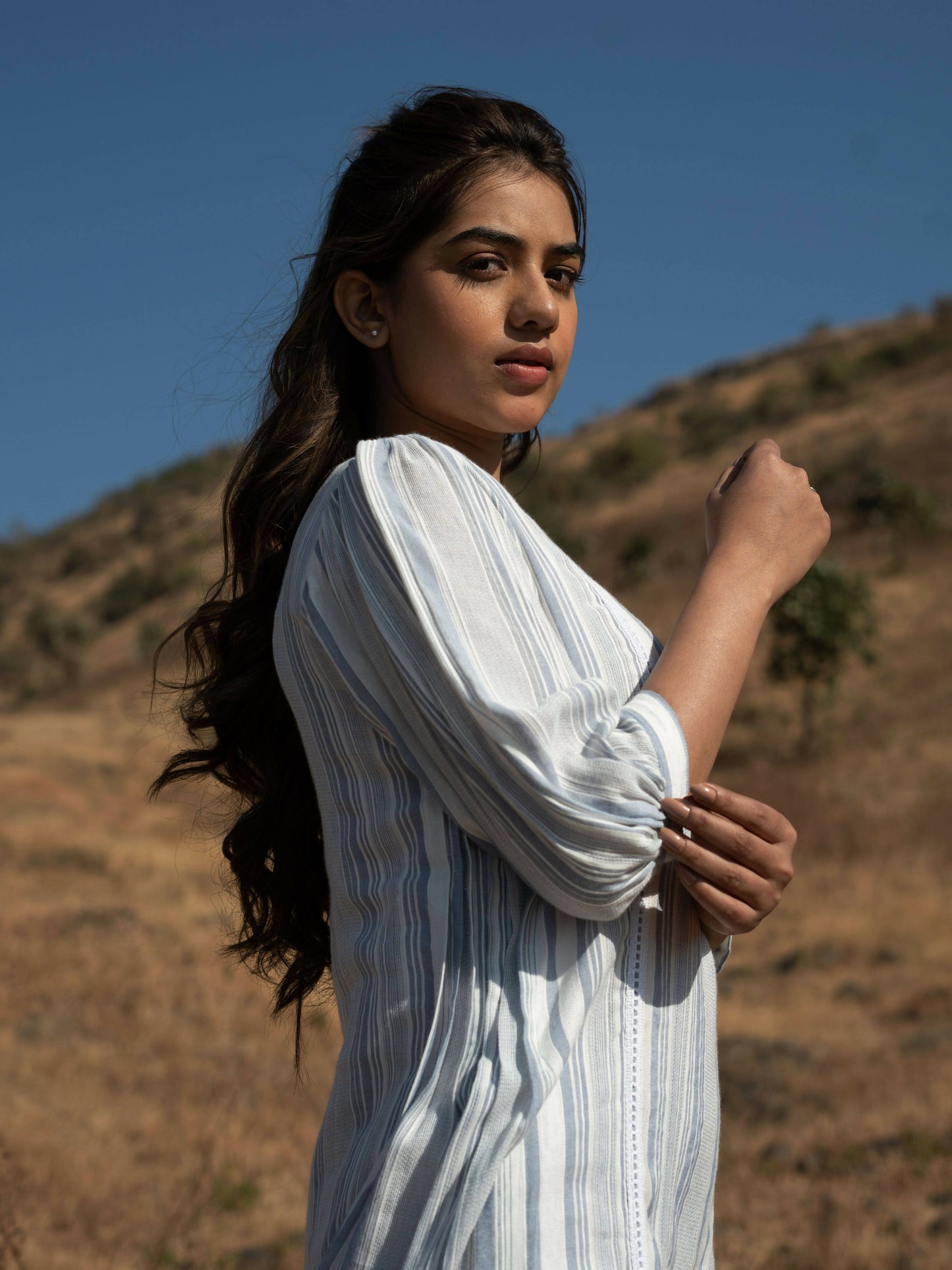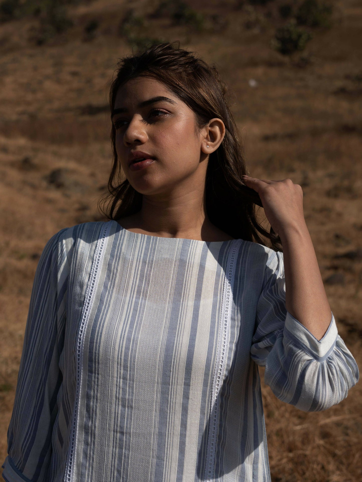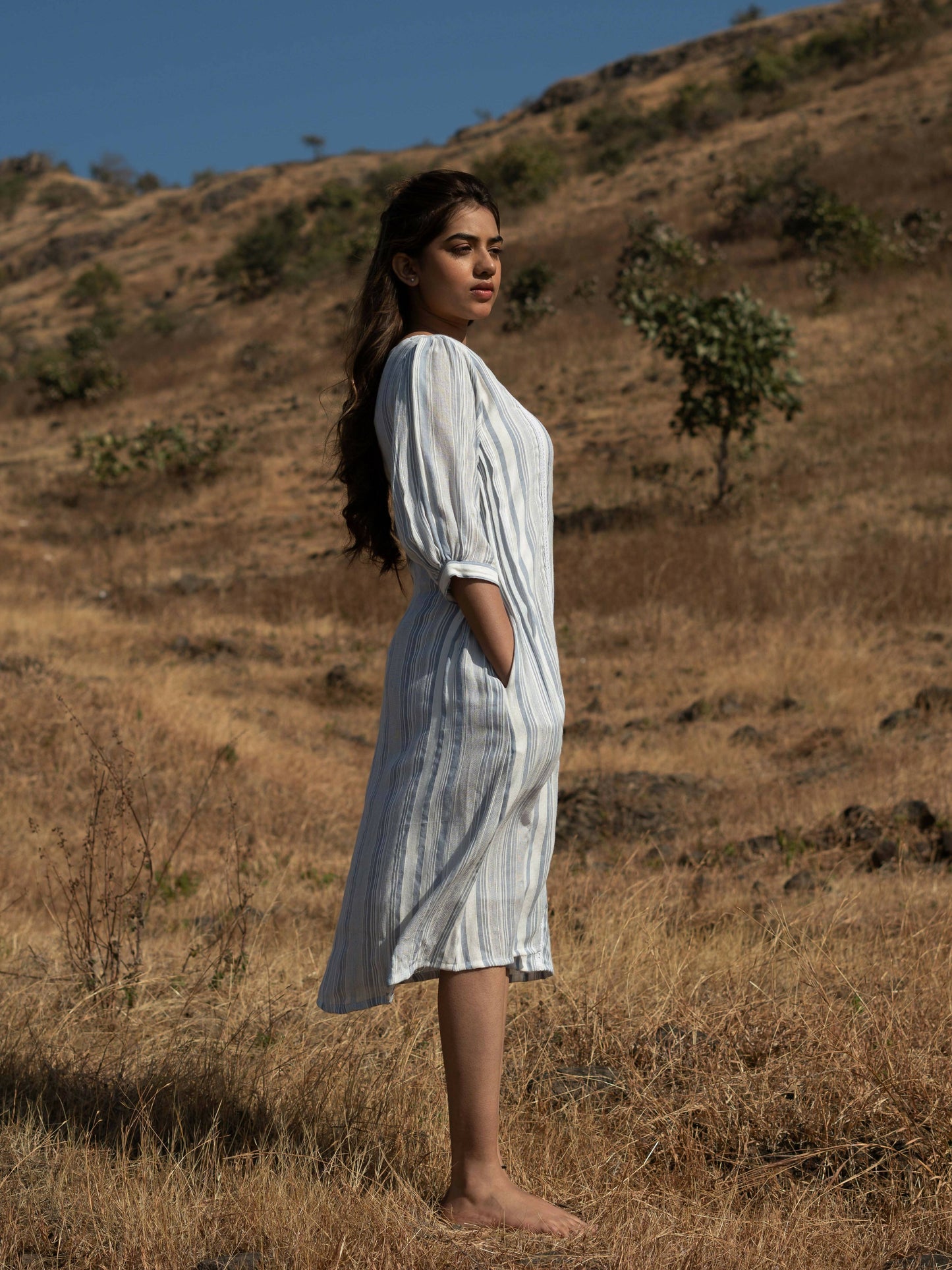 Greyish Blue - Off White knee length Dress with lace detailing on the front. The dress has inseam pockets.The dress comes with a Slip.