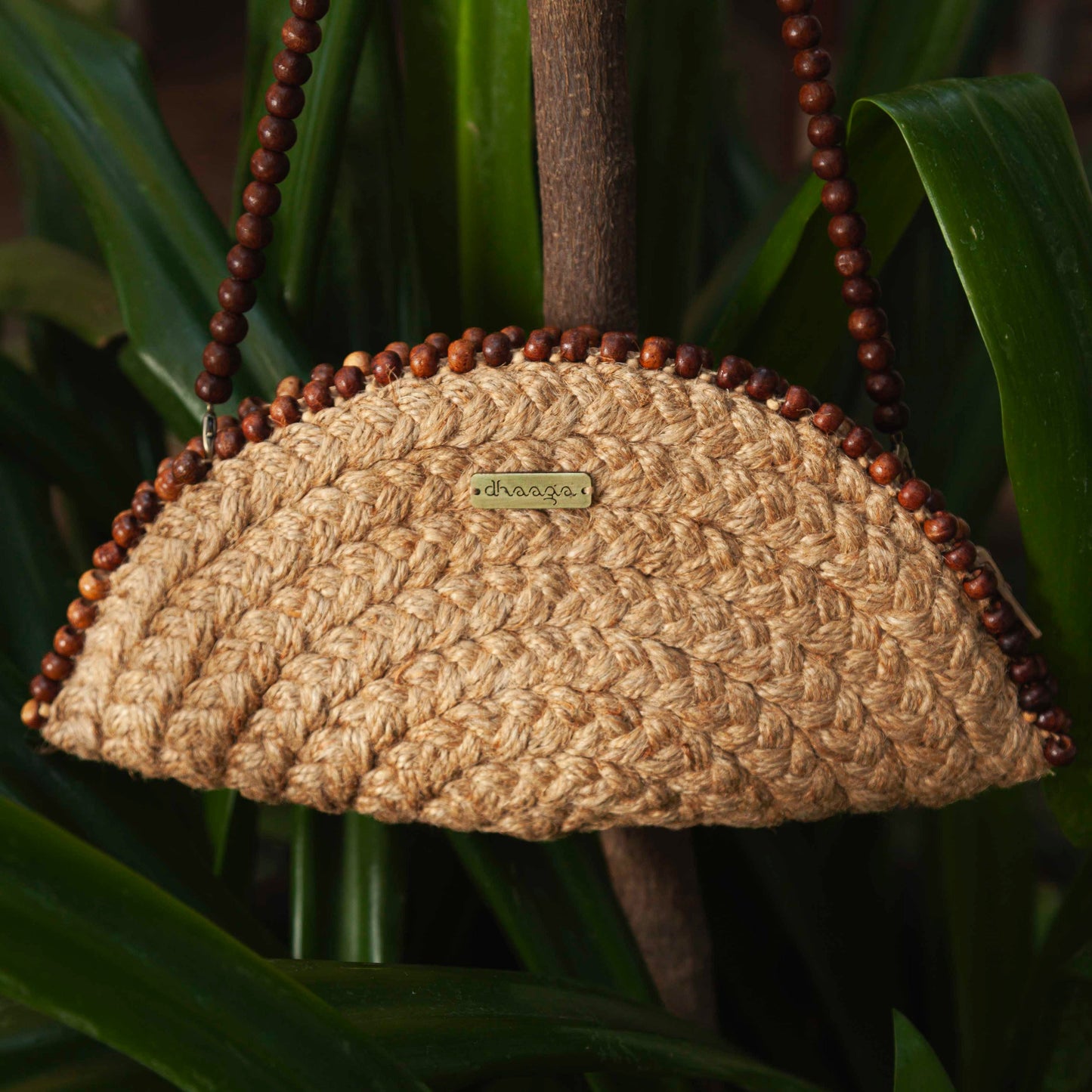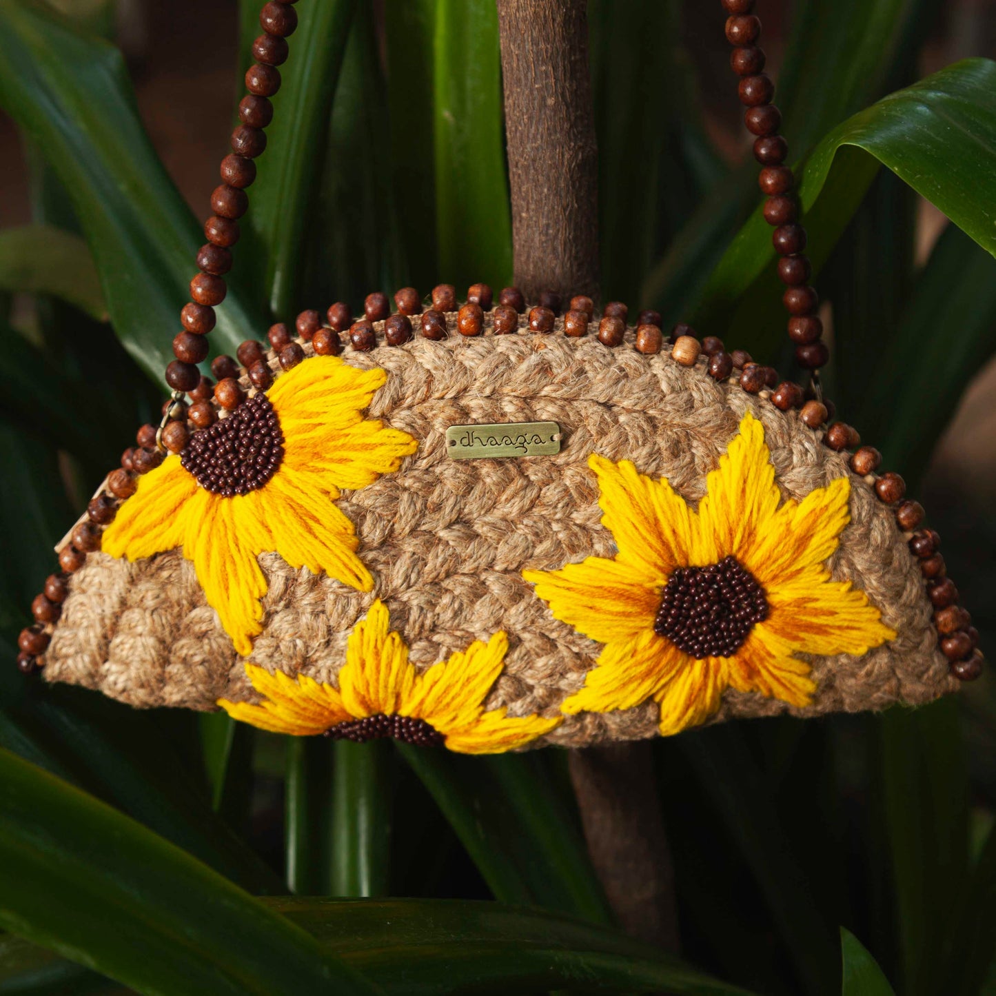 Your fresh spring and summer look with our Sunflower Meadow Clutch, a handcrafted masterpiece that embodies the essence of Sunflower Meadow half moon clutch bag, sunny days and blooming meadows. Adorned with vibrant sunflowers delicately embroidered on natural jute and lined with rustic wooden beads, this clutch radiates organic charm and natural beauty.