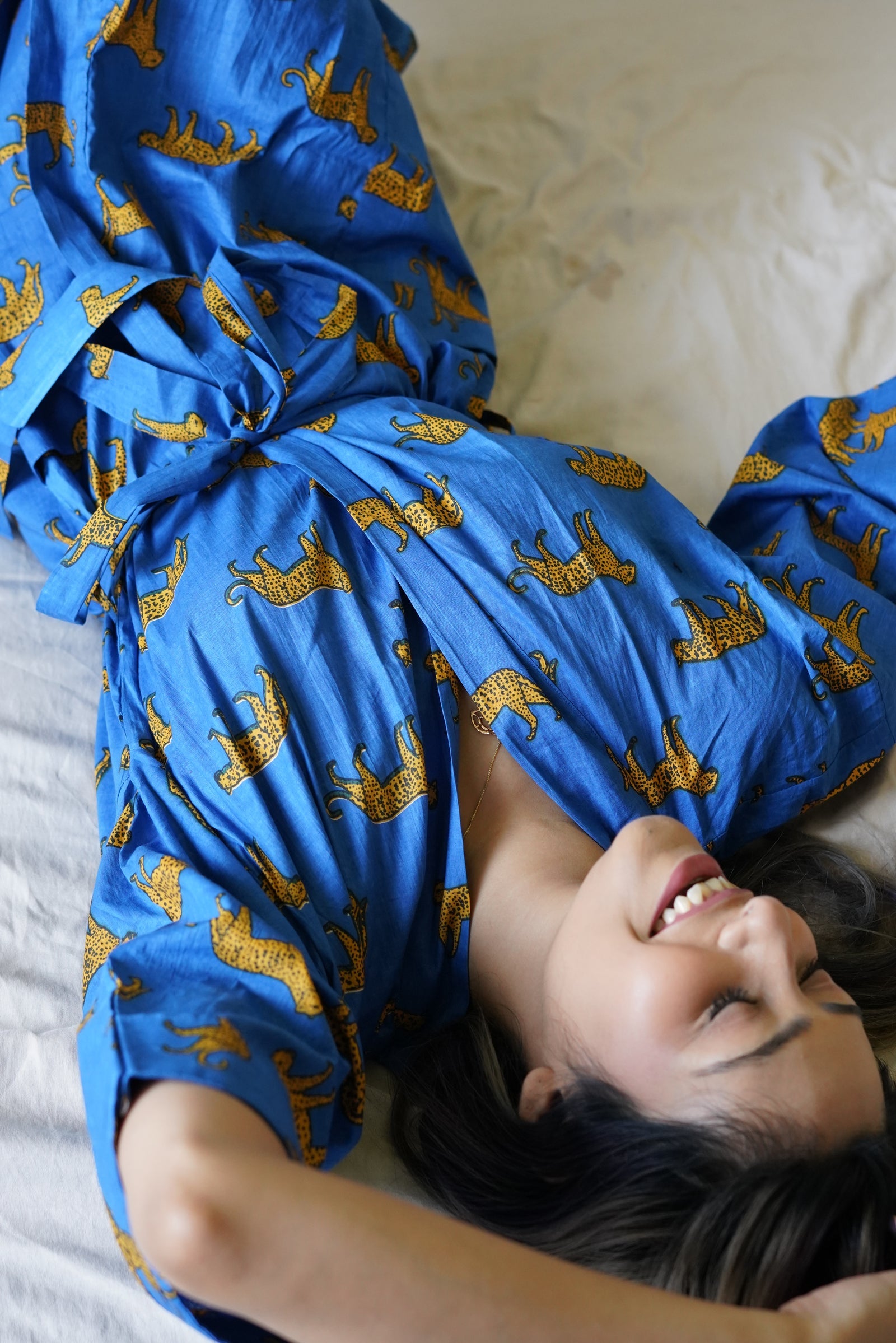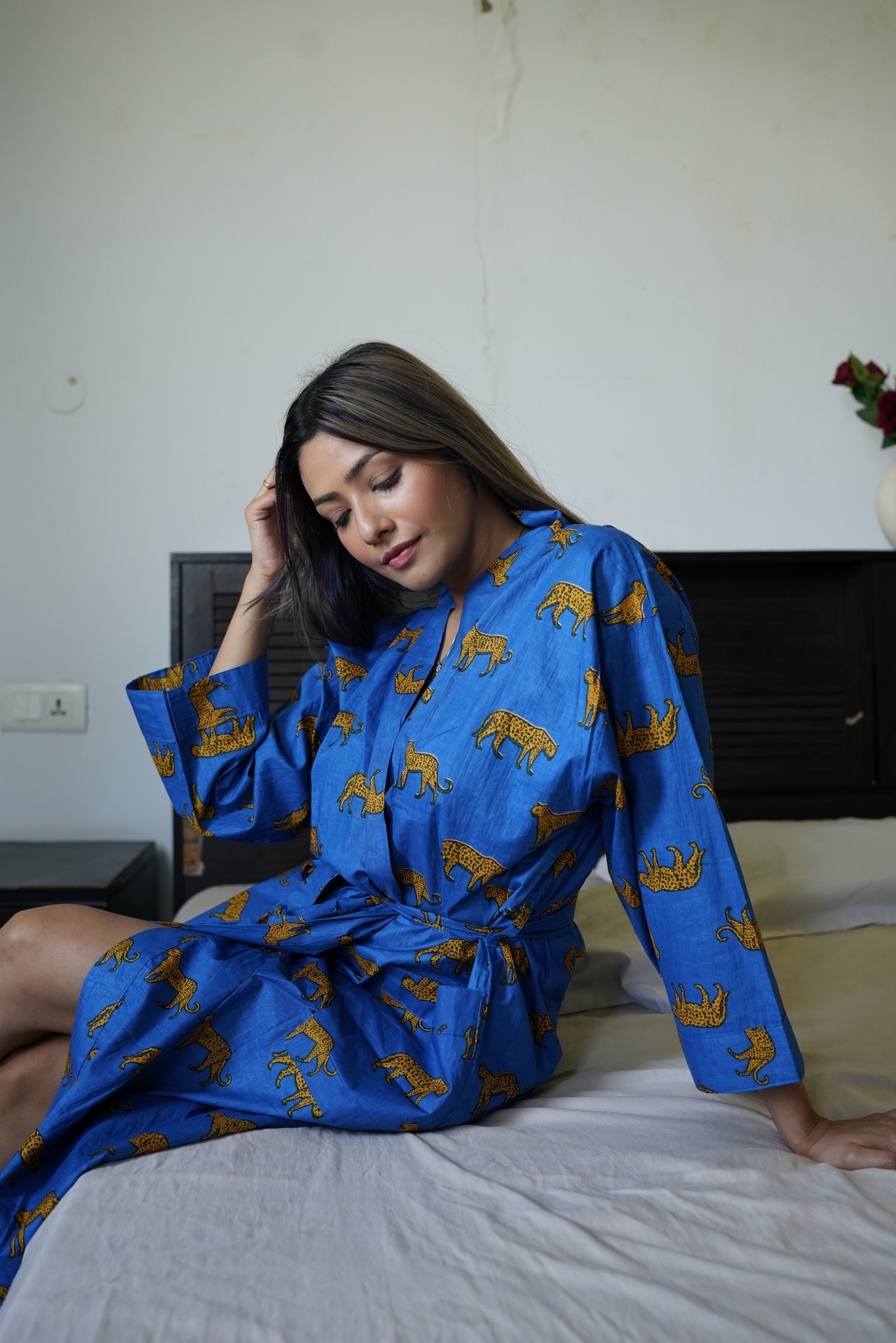 Embrace effortless luxury with our Wild And Free Robe — a lightweight, block-printed housecoat designed for ultimate comfort and style. Perfect for lounging at home, spa days, or as a chic cover-up at the beach or poolside. Crafted from 100% soft cotton cambric and printed with vibrant azo-free dyes, this robe features a flattering comfort fit, 3/4 sleeves, two handy front pockets, and a matching cotton belt for adjustable ease.